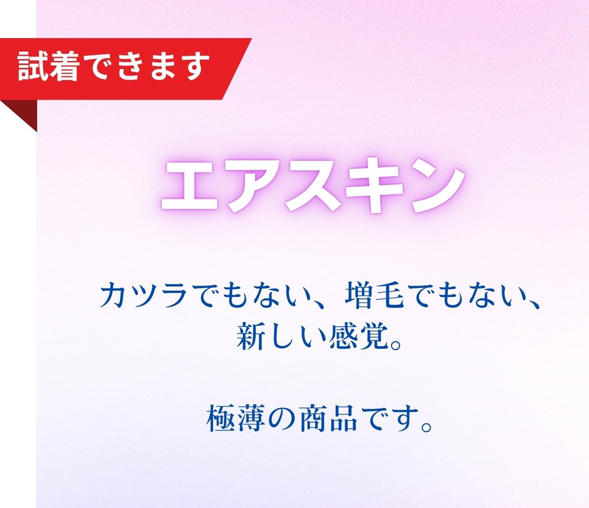 現在大手メーカー使用中の方でも分け目部分に人口皮膚を使ったかつらは多いと思いますが、人口皮膚はポリウレタン素材で作られているため通気が無く汗でベタベタになります。グッドジョブの新型タイプ(エアースキン)は人工皮膚なのに完全に通気するため今までの不快感がありません。頭皮はいつもサラサラですごせます。もちろん完全オーダーメイドであなたの希望通りのスタイルと自然さをお約束します。価格もオール以外は198,000円までの低価格を実現しました。